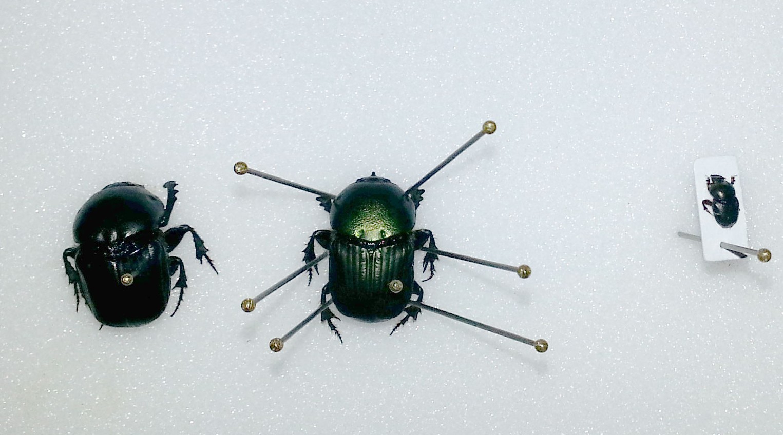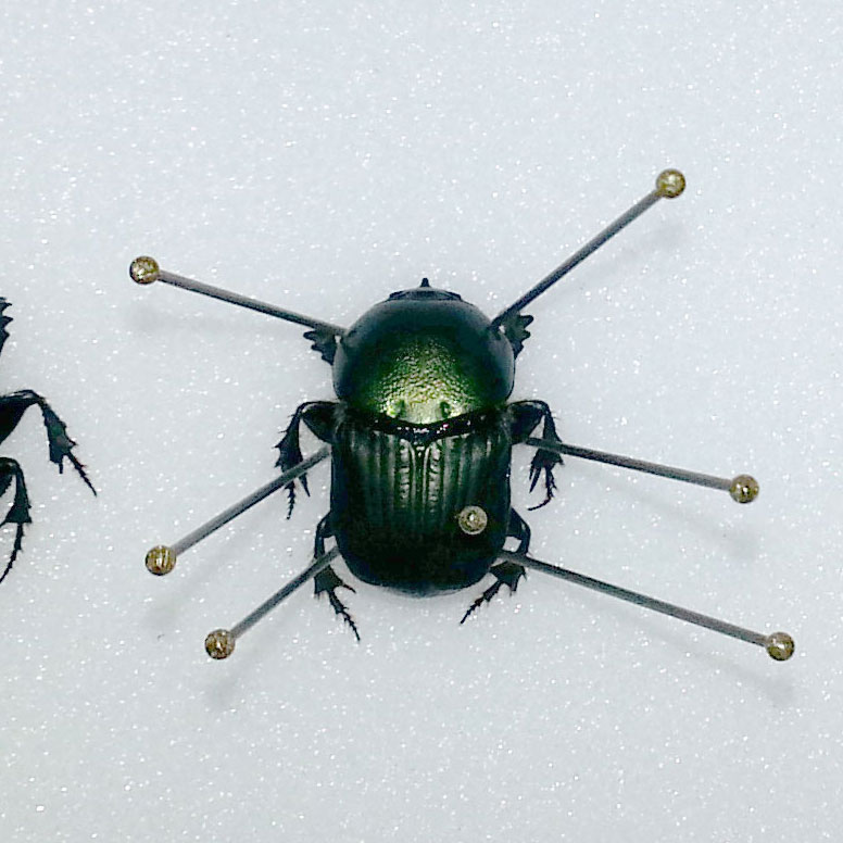 The scarab beetle in the centre of this image shows how pins are used to manipulate the legs whilst the specimen is drying, after which it will maintain its shape.