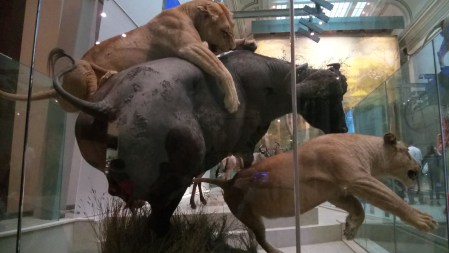 Beautiful taxidermy work of lions attacking a buffalo. I patiently waited 15 minutes until the case was clear of visitors for this photo. Photo by Jan Freedman.